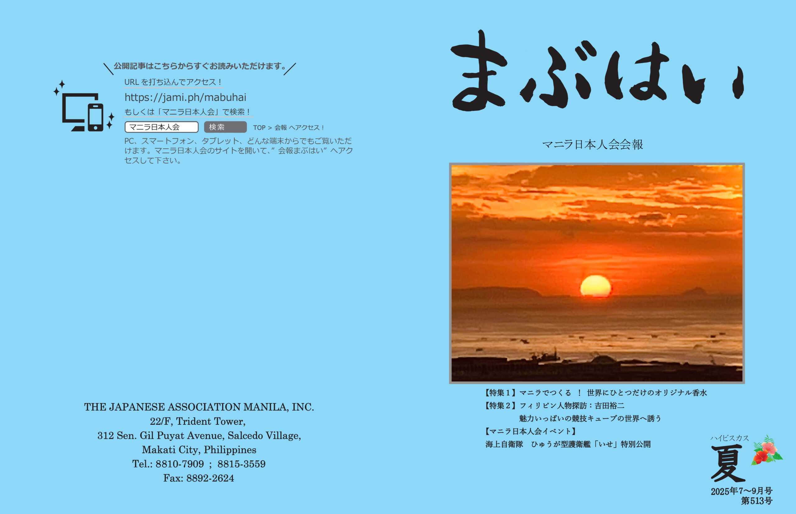 マニラ日本人会会報の「まぶはい」は、会員のための情報誌として、マニラ日本人会が1957年3月にマニラ日本人倶楽部として設立されて以来、数々の変遷を重ねて発刊され現在に至っています。